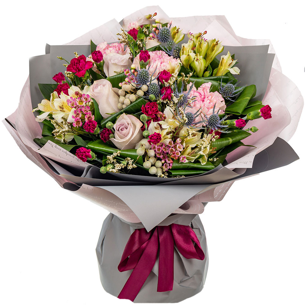 На фото представлен образец. Объем букета зависит от выбранного вами размера. Точное количество цветов и цветовую гамму вы можете уточнить у менеджера по телефону.