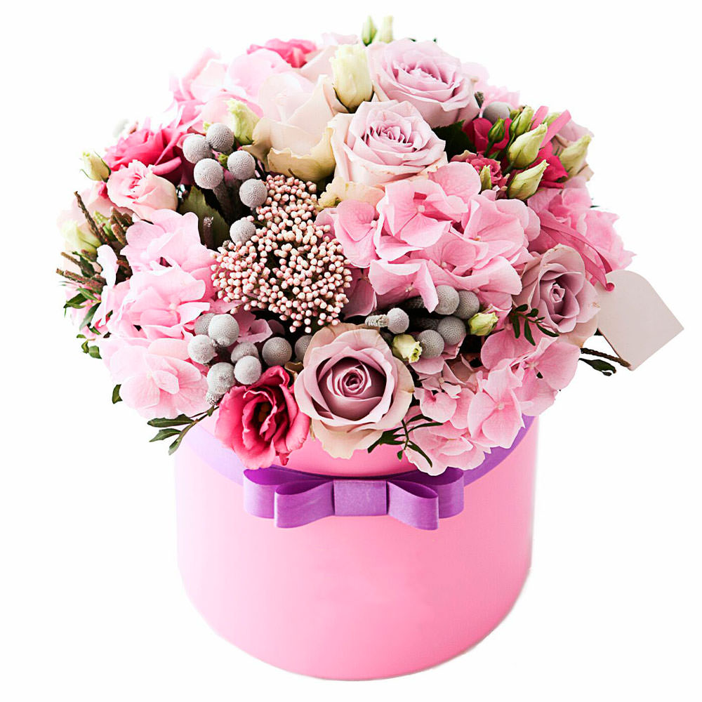 На фото представлен образец. Объем коробки зависит от выбранного вами размера. Точное количество цветов и цветовую гамму вы можете уточнить у менеджера по телефону.